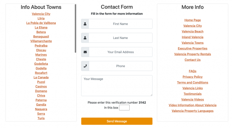 Within the quick links section there are three columns. A link to each town, a contact form and more of our information pages such as FAQs etc... If there are no properties featured in the town you click on or you cannot find anything that suits your requirements just send us a message via the contact form to let us know what you are looking for and we will start the search, remember we act as a personal property finder for our clients.