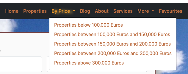 The Menu Bar takes you to various places you might want to get to quickly. It starts with the home button to bring you back to the homepage from wherever you may be in the site. Then you have a properties button which takes you to the homepage but just with properties, no blogs, favourite towns or anything. The "By Price" button allows you to search through the site at your preferred price point in the dropdown.
