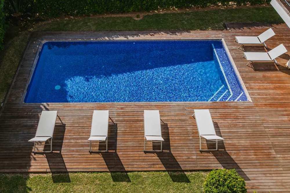 The fusion of materials is also contemplated in its exteriors, in which all its terraces are clad in teak with the contrast of the green of nature and the turquoise of the pool.”