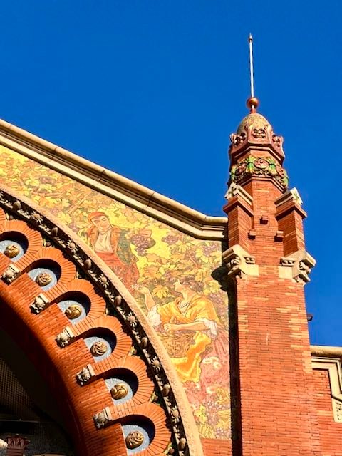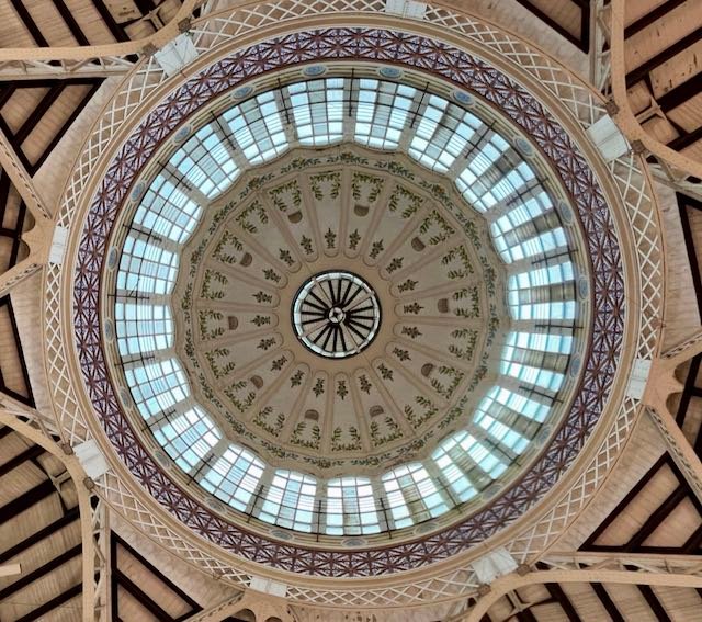 Still warm, still colourful, Valencia in winter still has the #ValenciaBlues to admire and remember always to look up in Valencia as the architecture is something else. This is at the Mercado de Colón.