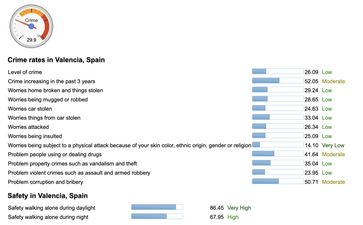 As a general rule of thumb Valencia is safe, very safe. You may be unfortunate and get a bag snatched or an unattended phone taken from a table, it's rare but it happens. You most likely won't have to worry about being mugged, stabbed, shot, or dying due to being in the wrong place at the wrong time when an active shooter appears out of nowhere. Valencia is one of the safest big cities in the World and truth is, so are most Spanish cities. Image and stats taken from Numbeo here.