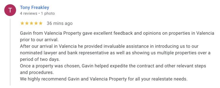 It's things like this that we are most proud of in our work. Doing a job well, doing it quickly and making our clients happy. The relationships we have built up over the years here in Valencia allow us to organise all of this from start to finish and make what is supposed to be one of the most stressful things you can do, buying a property, as smooth as silk. Yes, it can be done here in Spain! Three days later, Saturday morning as I write, we got a lovely review too