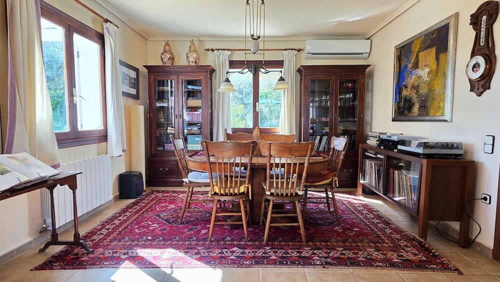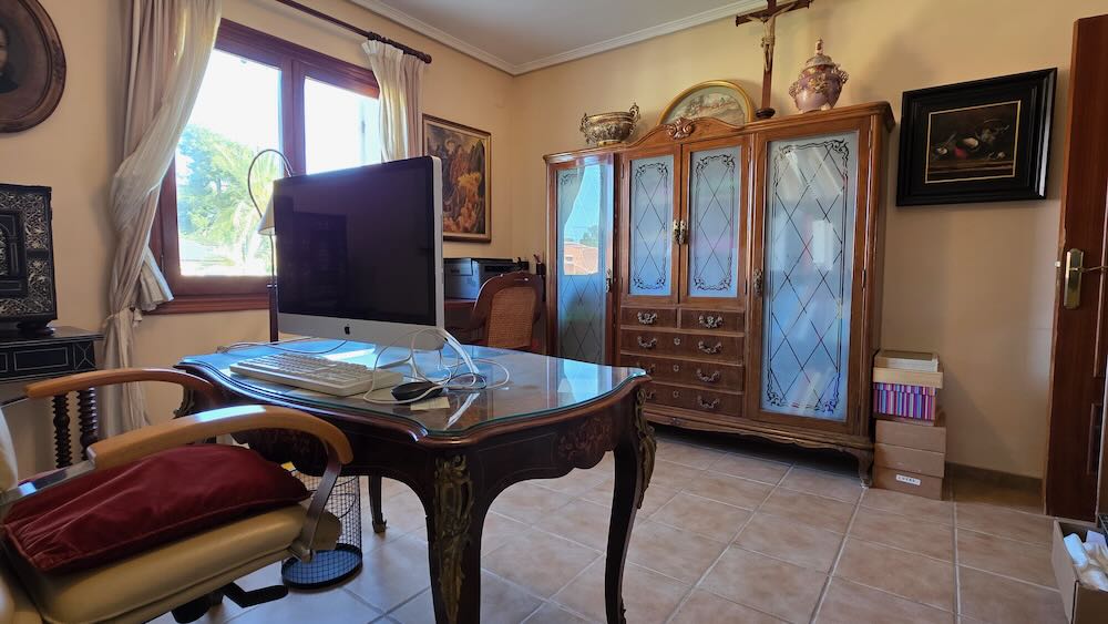 This is a 340m² detached chalet on a 1,500m² corner plot in L'Eliana. Six bedrooms, three bathrooms and toilet, a 50m² covered terrace, an 80m² semi-basement, and a garage that fits three cars (or two and the aforementioned snooker table). It feels like a country manor. It is, in fact, a ten-minute walk from the metro.