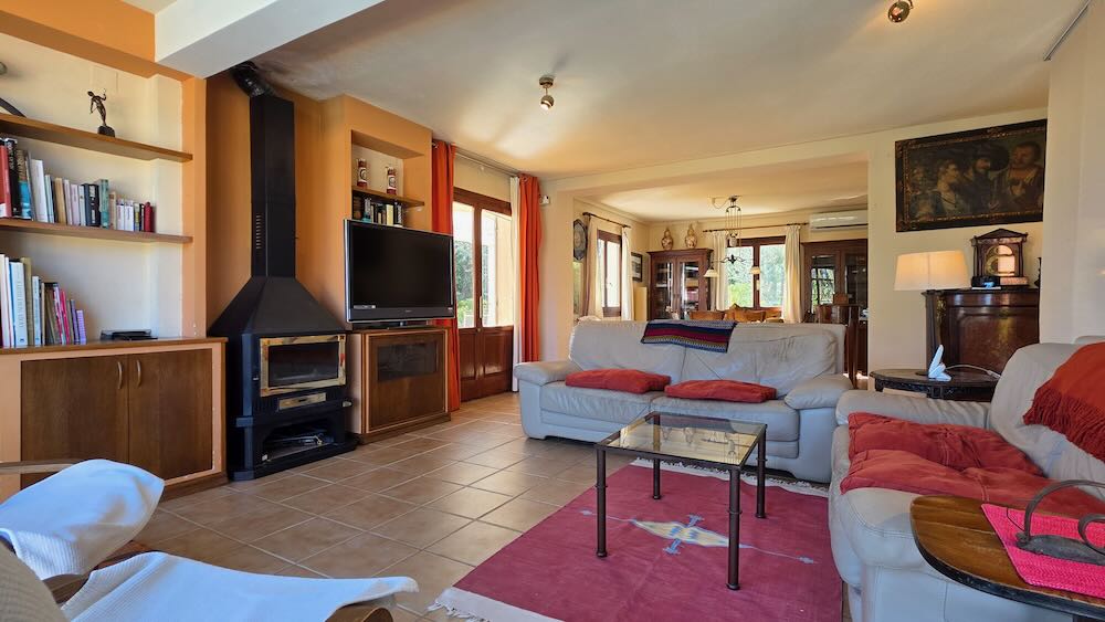 Gas central heating, air conditioning in multiple rooms, double-glazed wooden windows throughout.