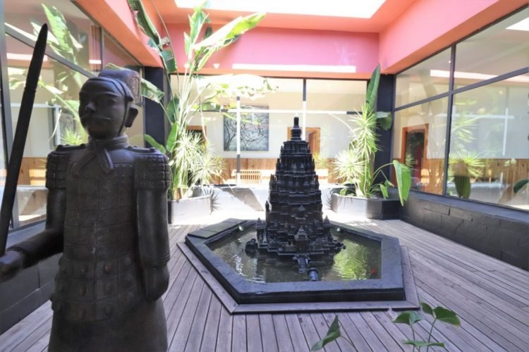 The house itself is all on one floor, so low profile from the outside. Inside however we have a lot of character. Wooden beams and stone tiling throughout, the house is centred around a lightwell containing a fountain, natural light everywhere. Should I mention elephant in the room? And by elephant, of course I mean Chinese soldier statue and temple. I'd better not, each to his own and look, character, innit?