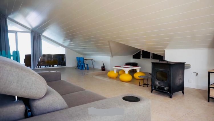 Living room open to the sea with terrace, fully equipped American kitchen with views of the sea and the pool. On the upper floor, it has a large open space/living room with a fireplace and access to two terraces, one with sea views and the other with views of the pool and mountains.