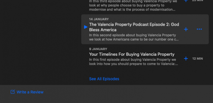4) Once done then send us a mail to information@www.valencia-property.com with the screenshots and the name you used on the Apple Podcast Review along with your four answers. On the podcast in 3 weeks time we will have a draw for the winner and if your name is announced we will contact you to get details to send you your prize. We will send the books anywhere in the World but would prefer to present them in person of course if you are around. If you have any questions then just tag me on Twitter @grahunt.
