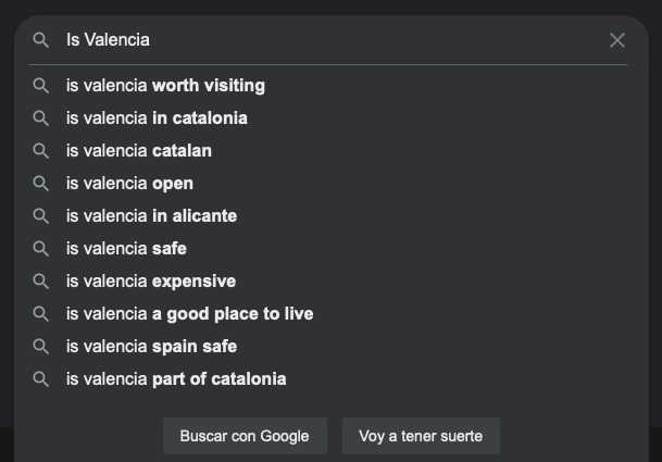 There is no accounting for what somebody may ask online. Google will supply you with the most popular questions they get asked about Valencia. If you type in "Is Valencia" you get the following (I did this without being signed into Google so previous searches aren't considered).
