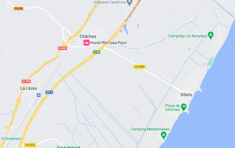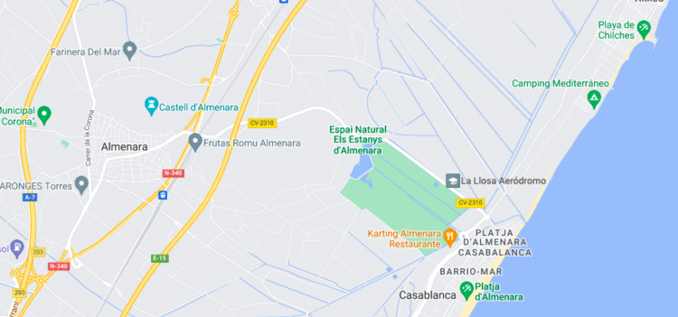 Therefore when we talk below about each Valencian town assume there is an original town a couple of kilometres inland and the newer area known with that town's name plus Playa to distinguish it from the original town. See below in the two maps, Chilches and Xilxes the beach area, and Almenara and Almenara Playa separated by the motorway and also one of the remaining marshlands. Straight roads connecting the original towns with the beach towns and lots of blue spurs indicating irrigation canals. If you're into Twitching (Birdwatching) you'll love these areas and the Albufera to the south of the city.