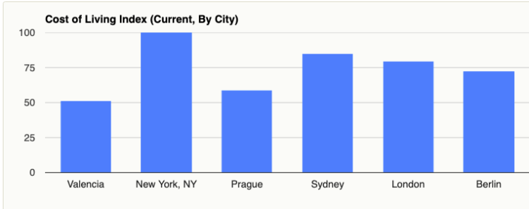 When comparing Valencia to other places it is also considerably cheaper but New York is the biggie. If the cost of living is set to 100 there then Valencia is exactly half as expensive on day to day costs when considering what your earnings buy you. As stated in Numbeo: