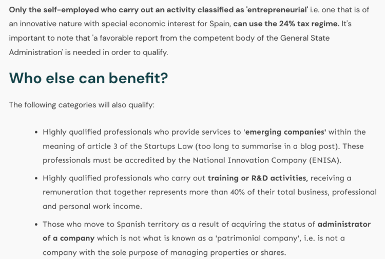 However one of the big things about the announcement of the DNV was that applicants could possibly benefit from the Beckham law and get a flat tax rate of 24% on their earnings, much less tax therefore for people earning around 60k a year and more. It seems that it is almost impossible to qualify for the Beckham Law as a self employed person or freelancer. There are exceptions as described below from Louise Carr's Moving to Spain guide.