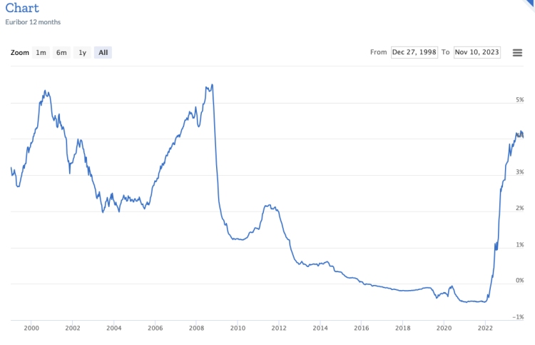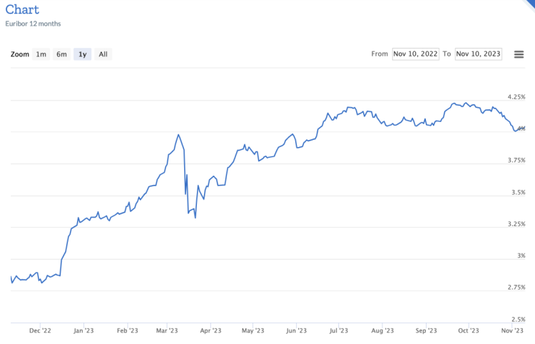 Since July of this year, see below, Euribor rises have settled down and the tendency is down since late September. Forecasts are for Euribor to continue falling in 2024 with rates of around 3% by the end of the year.
