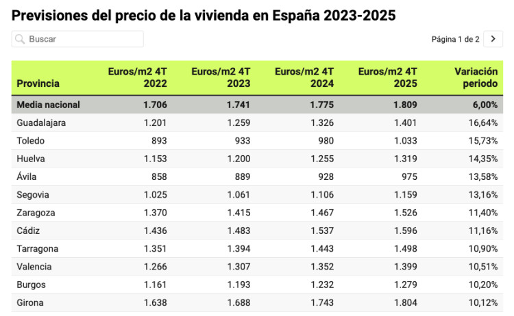 The expectations for the market in Valencia for the next two years are for an increase in prices of just under 10% as demand remains high. This is not the highest in Spain, that mantle belongs to Guadalajara, but it is above the national average of around 6% in the period. The graph below was from late last year but it has been proved to be right up to now with the caveat that the price rises have actually been higher in the year to the end of 2023.