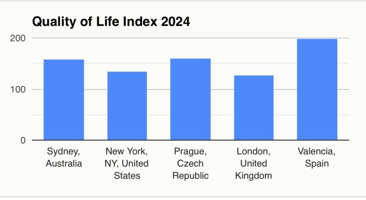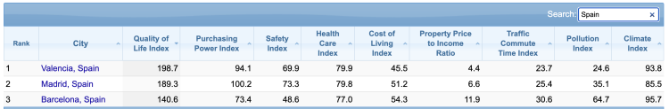For me the most important thing is the Quality of Life Index because this takes into account everything rather than just income and costs. Climate, healthcare, wellbeing, safety, commute times and pollution are major issues that affect our day to day wellbeing and happiness and Valencia ranks well on all of them. It needs to because on a pure income basis it ranks below many comparable places. In terms of quality of life for the three main cities in Spain, Valencia ranks highly. Barcelona only beats Valencia on the climate index whereas Madrid beats it on a couple of indices with the most striking being the purchasing power index, important because salaries are higher in Madrid.