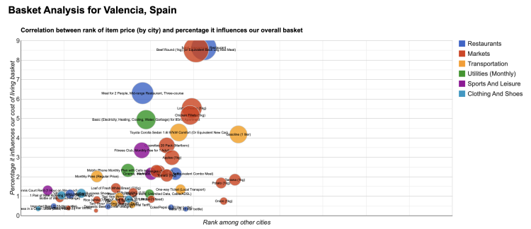 You can see a bigger and interactive version of the image here. The bigger the circle the more effect on the whole ranking and the bigger circles tend to be the higher ticket items such as rent, mortgage costs, and utilities rather than a summer dress from Zara (And yes that is one and it is the smallest circle to the bottom left of the graph) You can surmise from the weighting given to restaurants that we are talking about more affluent international respondents rather than people who have lived in Valencia forever although Valencians do like going out to eat.