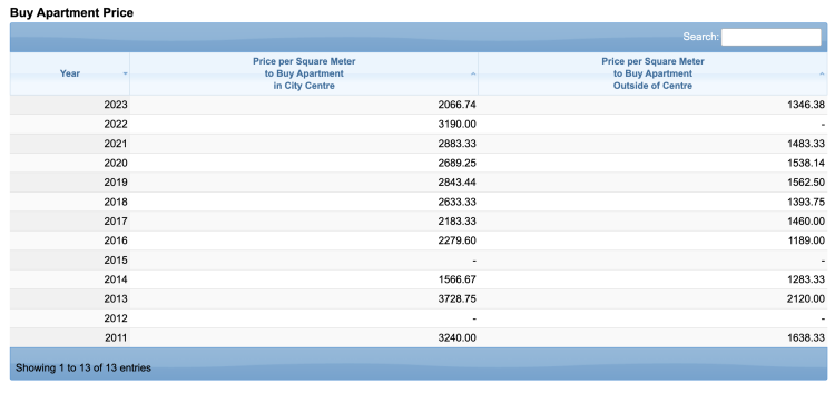 The second is the property price to income ratio. As I said prices have gone down in the centre to 2125 Euros per square metre in the centre (Apparently) They haven't. This is from 57 reports from people regarding property costs this year but many of those are renting. The rental prices are more or less correct though and reflect the 26% rise in prices in the last year.