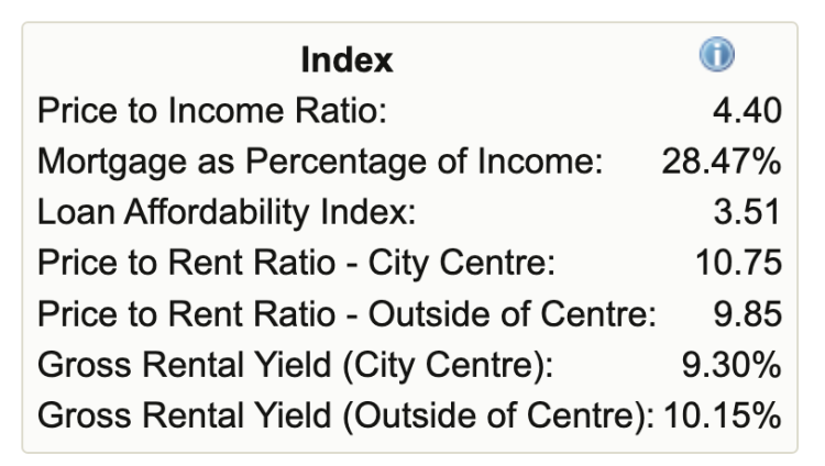 As mentioned, the average salary reported in Valencia has gone up considerably in the last few years and that is also because those reporting to Numbeo tend to be higher income recent arrivals who come to Valencia as they can work from anywhere. It affects the percentage of income required to pay a mortgage as another example as the numbers are based on buying a 90m2 apartment at 2125 Euros per square metre at a 2.7% interest rate, we'll get onto that percentage in a moment. In fact it affects all of the following as examples.