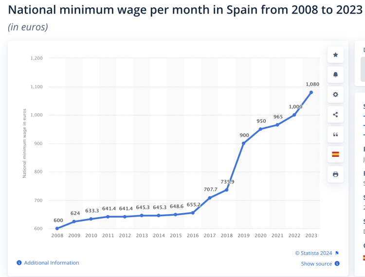 Equally, our clients were on a much higher salary or income levels than the net 1515 Euros reported last year. I still think the 33% rise from 217 respondents is huge but it shows the effect of two things. Firstly, more well off people moving into Valencia, of that there is no doubt. Secondly the rise in the minimum wage in Spain which has gone up by around 80% in the last eight years after not moving much for years (Now at 1134 Euros for 2024 compared with 655 Euros in 2016 see the graph below from Statista. The previous eight years had only seen a move of 55 Euros) meaning those reporting at the lower levels are reporting higher amounts.