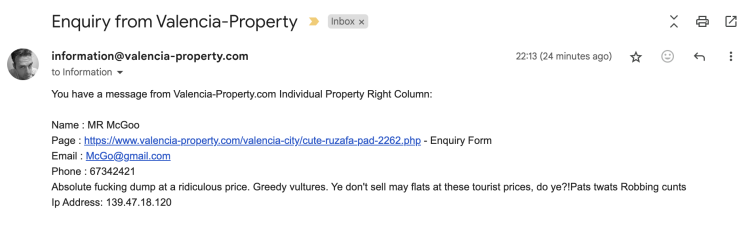 I was very tempted to answer of course but know that it was a fake email address and number so it wasn't really worth it, but keyboard warriors have to keyboard warrior we know. (The place he mentioned had sold two days before at asking price to a local buyer so it wasn't as bad as he claimed. Judge for yourself) This property is much better by the way. However, I sort of understand the sentiment. There is anger out there as exemplified by the protest in Valencia last week and the previous protests in Barcelona and Madrid, and that's because we live in the society we live in and things are as they are.