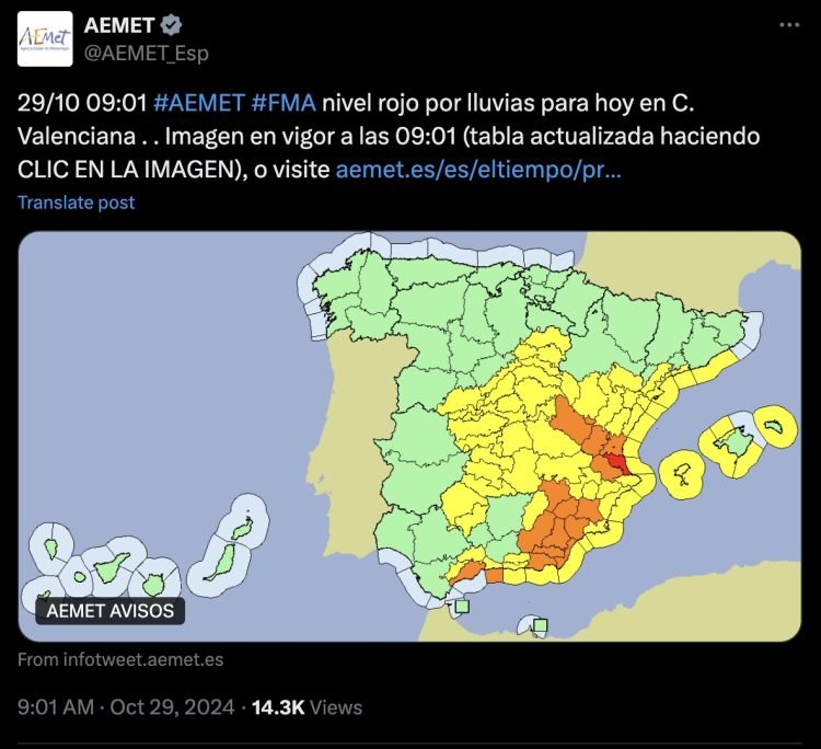 The University told everyone to not bother coming into work on Tuesday morning. They knew what could happen as the Spanish National Weather Service (AEMET) had put out a red alert (This tweet is taken from 9am on Tuesday).