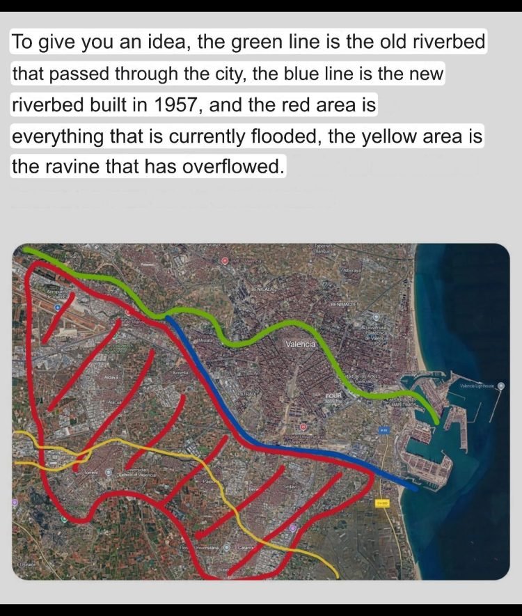 It must be pointed out that in Valencia it didn't even rain on Tuesday afternoon and yet just 5-6km away places were underwater! Valencia got lucky too. However the new riverbed built after the flooding of 1957 held firm and protected the city itself from the flood waters. If the Turia had still gone through the city then it would have been totally underwater. Now the question has to be asked as to what to do to protect the areas to the south of the city from future extreme weather events as they will happen more.