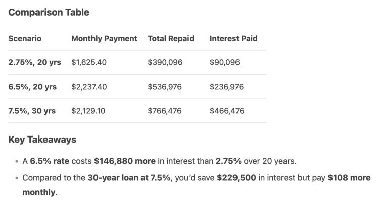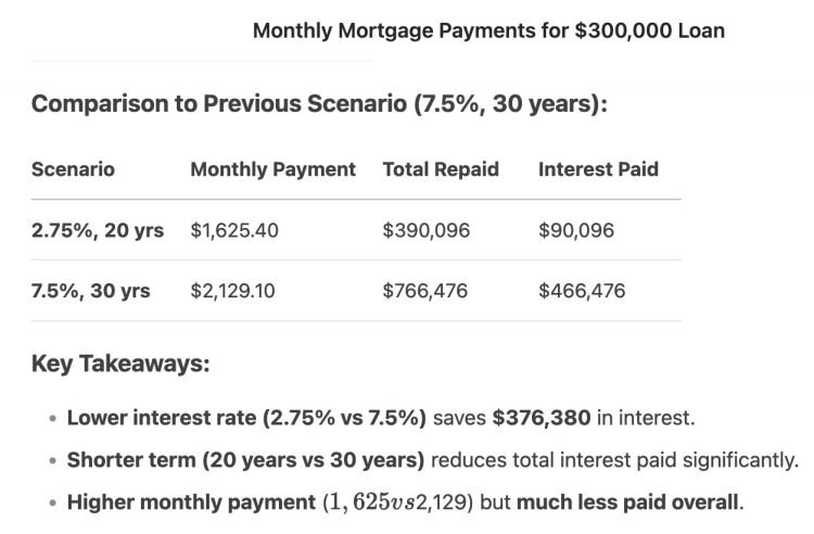 Meanwhile Spain's mortgages fall under the European Central Bank Interest Rates. Currently you can get a 20 year fixed rate mortgage offer for between 2.49% with discounts and 3.75%. Average is around 2.75% which is why we used that in the following example. We compared a 20 year fixed rate mortgage in Spain at 2.75% with a 30 year fixed rate mortgage in the USA at 7.5%, for the same amount, 300,000 Euros or Dollars. And there are some major takeaways from that.