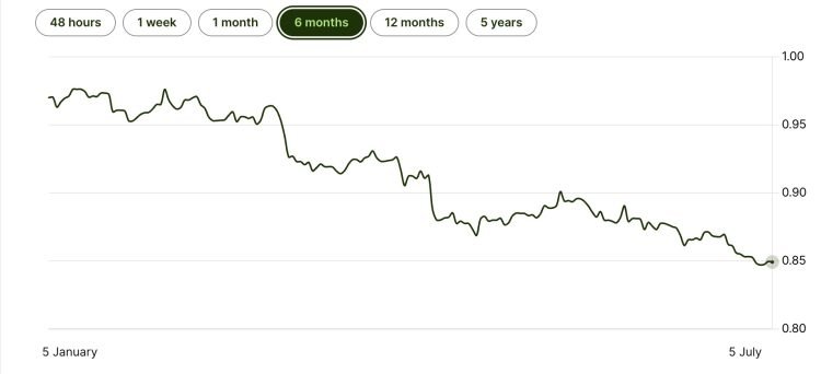 We are finding that many of our North American clients are choosing to get a mortgage, not because they need it but because the mortgage rates in the Eurozone are significantly lower than those in North America and below the interest rates being given for savings in the States. Just this week in a client meeting the potential buyer decided to investigate a mortgage as their investments in the States are paying between 6-8% and we can definitely get them a mortgage around the 3% mark. There is a currency risk of course as the dollar falls due to the incompetent bunch of idiots running the US economy (see the below graph of the dollar to Euro value over the last six months) and that's the effect of gross incompetence and idiocy. The last time the dollar was this low against the Euro was at the end of Trump's last four year disaster before it recovered under Biden. Trump took it down to 0.81c last time on the 6th January 2021 (Bonus points for guessing what happened that day)