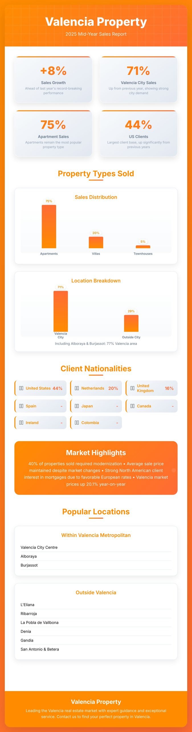 71% of our sales this year have been in the city of Valencia and 29% outside. So yes, compared with 2024 we are again seeing a rise in the number of apartments sold in Valencia city itself. When you consider that some of our other sales have been in Alboraya and Burjassot, essentially parts of Valencia these days, then that percentage rises to 77%. Outside the city we have seen the usual suspects of L'Eliana, Ribarroja, la Pobla de Vallbona, San Antonio and Betera appear and further afield we have representation from Denia, Gandia, Lliria and Godelleta. Still nothing in Naquera and Serra this year yet but we remain hopeful with some of the properties we have for sale there.