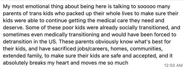 Liz told us "I'm a middle aged, middle class trans woman from Philadelphia. My wife, son and I moved here just a month ago, and while we are still super new we expect to be here long term, and like many wonder why we didn't do this sooner. Our reasons for moving here were the same as many others, when Trump was reelected we worried about the erosion of our rights as well as the emboldening of his voters to do and be worse and worse, and every day we've been here watching the news back in the US we feel more and more grateful to have the privilege to have left."