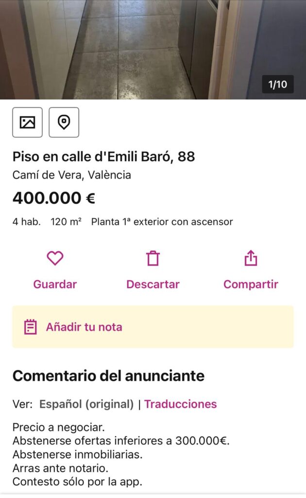 (It's interesting to note that the ad has now changed two days after the screenshot was taken. All it says now is "No agents" and "Deposit at notary office". There are ten awful photos and no contact details provided. It's probably a scam)